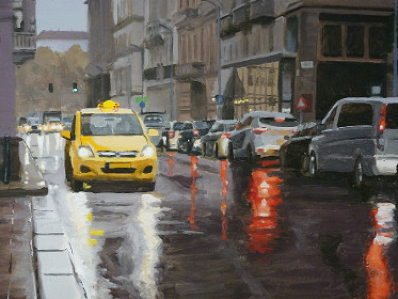 Taxi in regenachtige stad |Acrylverf | Toon Nagtegaal